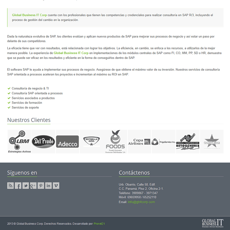 Este desarrollo significó para nosotros atender un cliente extranjero, que deseaba un sitio web fresco, ligero, que se puediera visualizar correctamente en cualquier dispositivo y en cualquier navegador, con un vistoso slider para darle un toque de dinamismo y con toda la información relevante para sus clientes actuales y para los que estan por venir. Este sitio web es autoadministrable, lo que le permite al cliente ir actualizando el contedio del sitio. Uno de los requerimientos, en el cual se hizo mayor enfasis, fue el marketing del sitio, cuidamos mucho la optimización para los buscadores y estmos en constante seguimiento de la analítica de la página para hacer los cambios que permitan posicionar la página en los principales resultados de los buscadores, de acuerdo al área de la empresa.